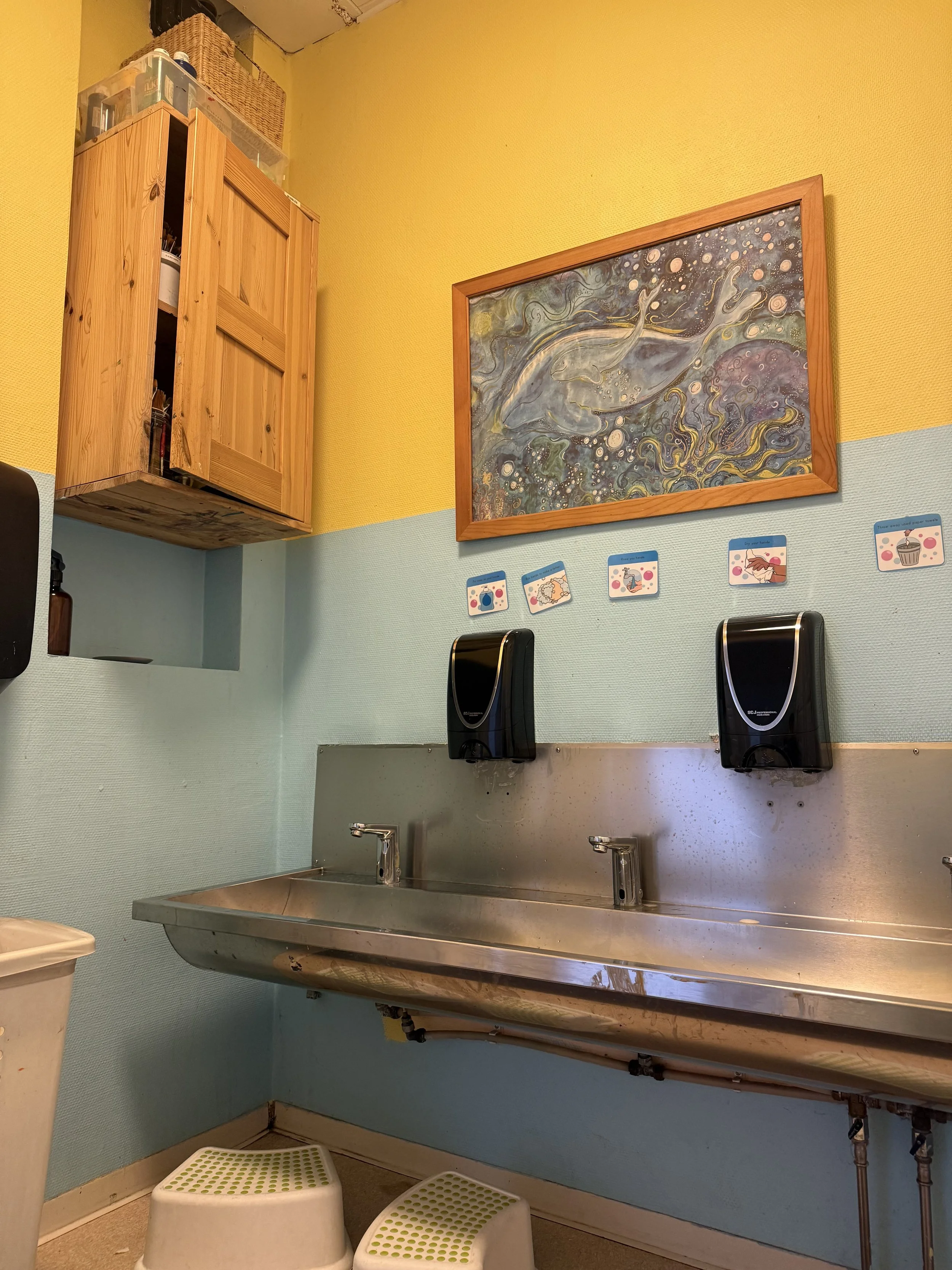 Ce qui pour moi représente de manière concrète cette volonté, c’est cette salle d’eau ouverte, sans porte où chaque enfant va se laver les mains de lui même, en rentrant de l’extérieur, avant et après le repas, après un change…